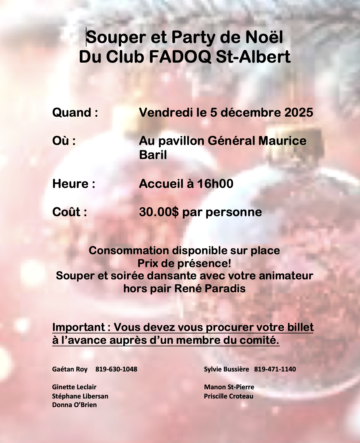 Vendredi le 5 décembre 2025 au Pavillon général Maurice Baril dès 16h au coût de 30 $ par personne